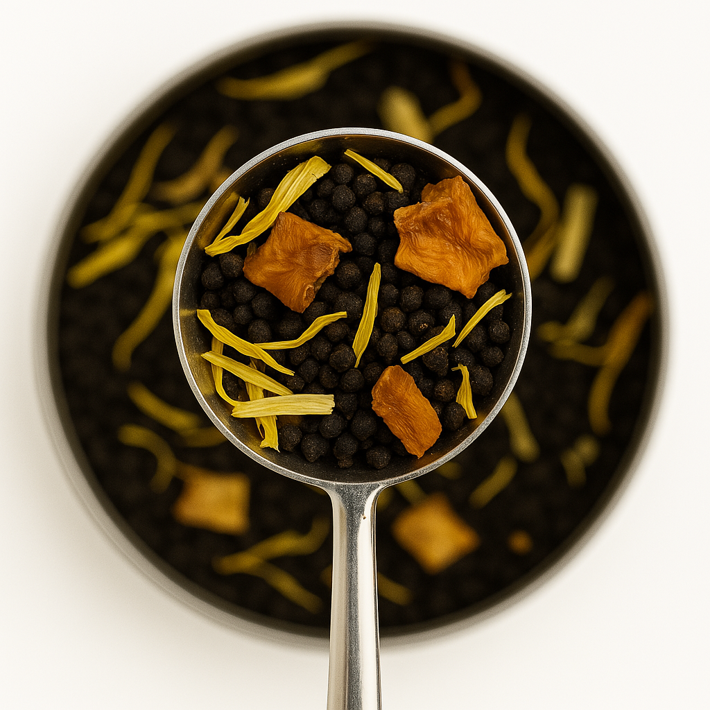 Réveil Tropical est une invitation à l'éveil dans une ambiance exotique, combinant la robustesse du thé noir Assam avec la vivacité du ginseng et les saveurs ensoleillées de mangue et papaye.