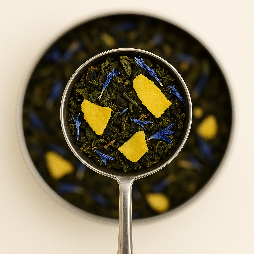 Ingrédients: Thé vert* - Oolong* - Pêche - Fleur de bleuet* - Réglisse* - Arôme naturel de Pêche-Vanille.